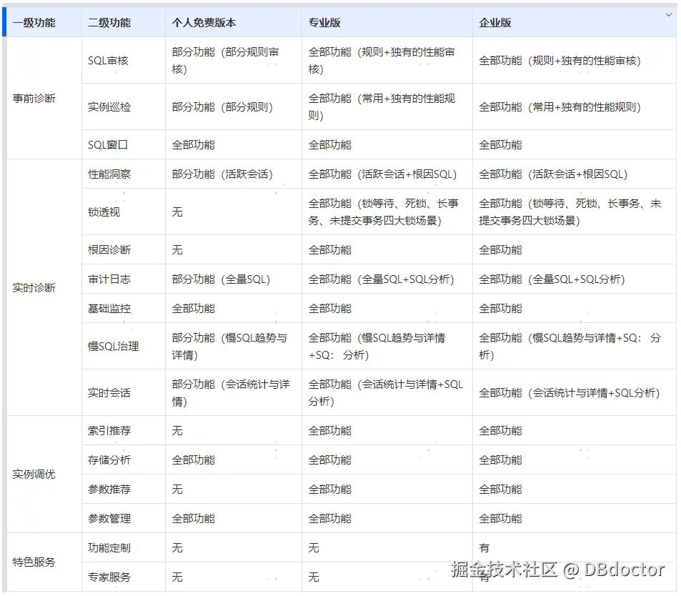 DBdoctor当前有个人版(永久免费使用)、专业版(公众号免费自助申请)、企业版(专业按需定制)三个版本,您可根据需要进行选择: