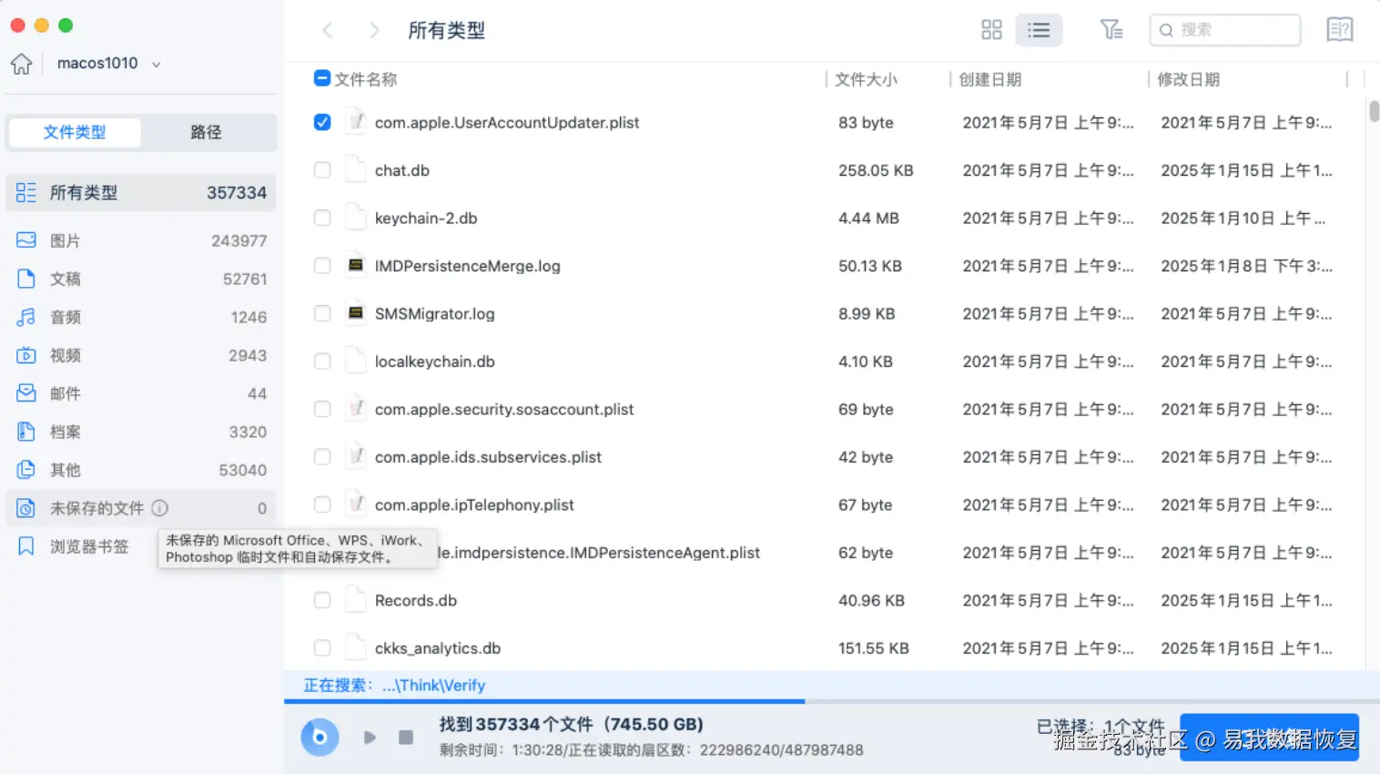 2.等待扫描搜索完成,在扫描过程中如果发现Mac隐藏文件可以直接进行免费预览,以及执行恢复操作,也可以暂停或终止扫描。