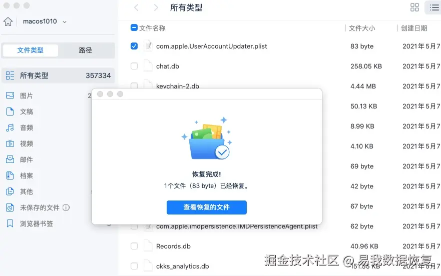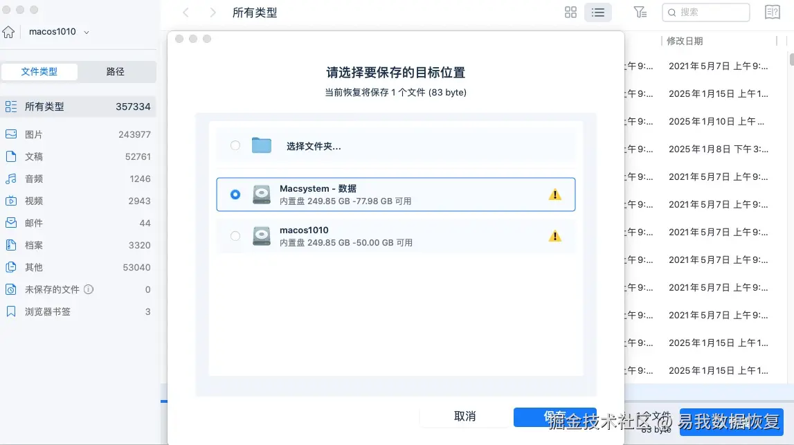 3.找到Mac上的隐藏文件后点击立即恢复,并选择保存的位置,切记不要保存到源盘,避免数据被覆盖。