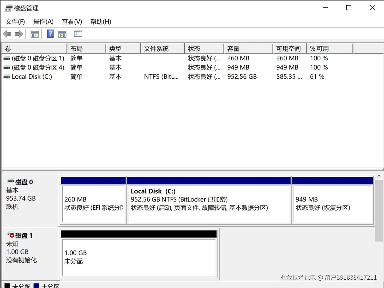 如果一切顺利的话,打开磁盘管理,你将会看到一个1G的未分配分区