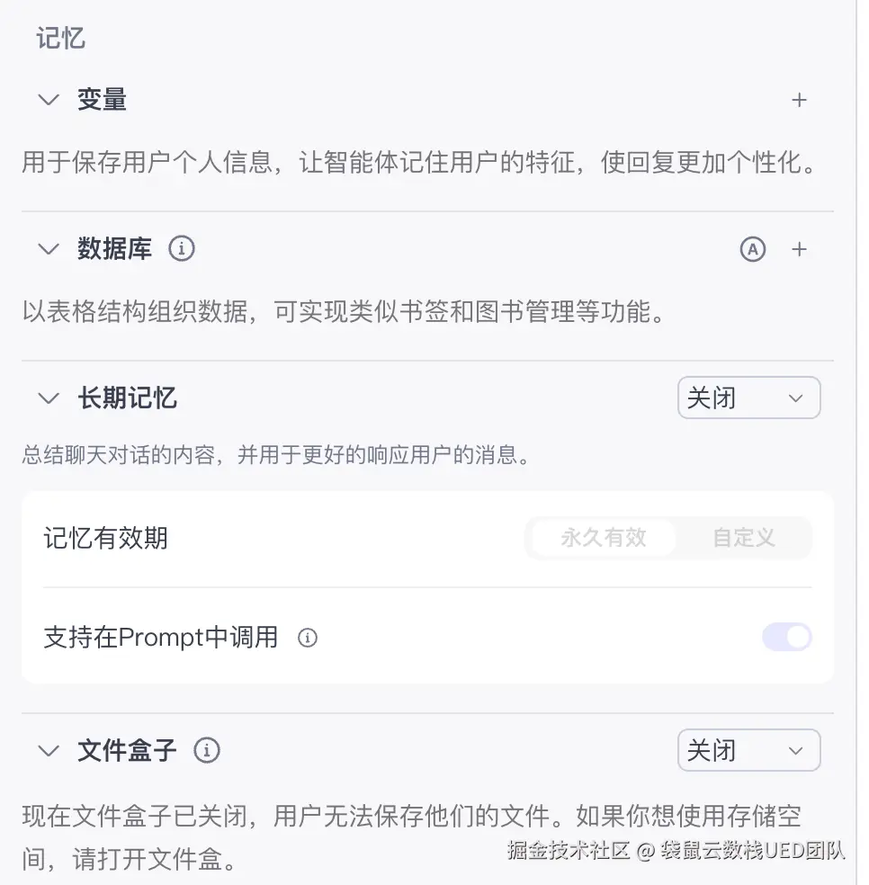 - 持久化的记忆能力:提供了方便 AI 交互的数据库记忆能力,可持久记住用户对话的重要参数或内容。创建一个数据库来记录阅读笔记,包括书名、阅读进度和个人注释。有了数据库,智能体就可以通过查询数据库中的数据来提供更准确的答案。