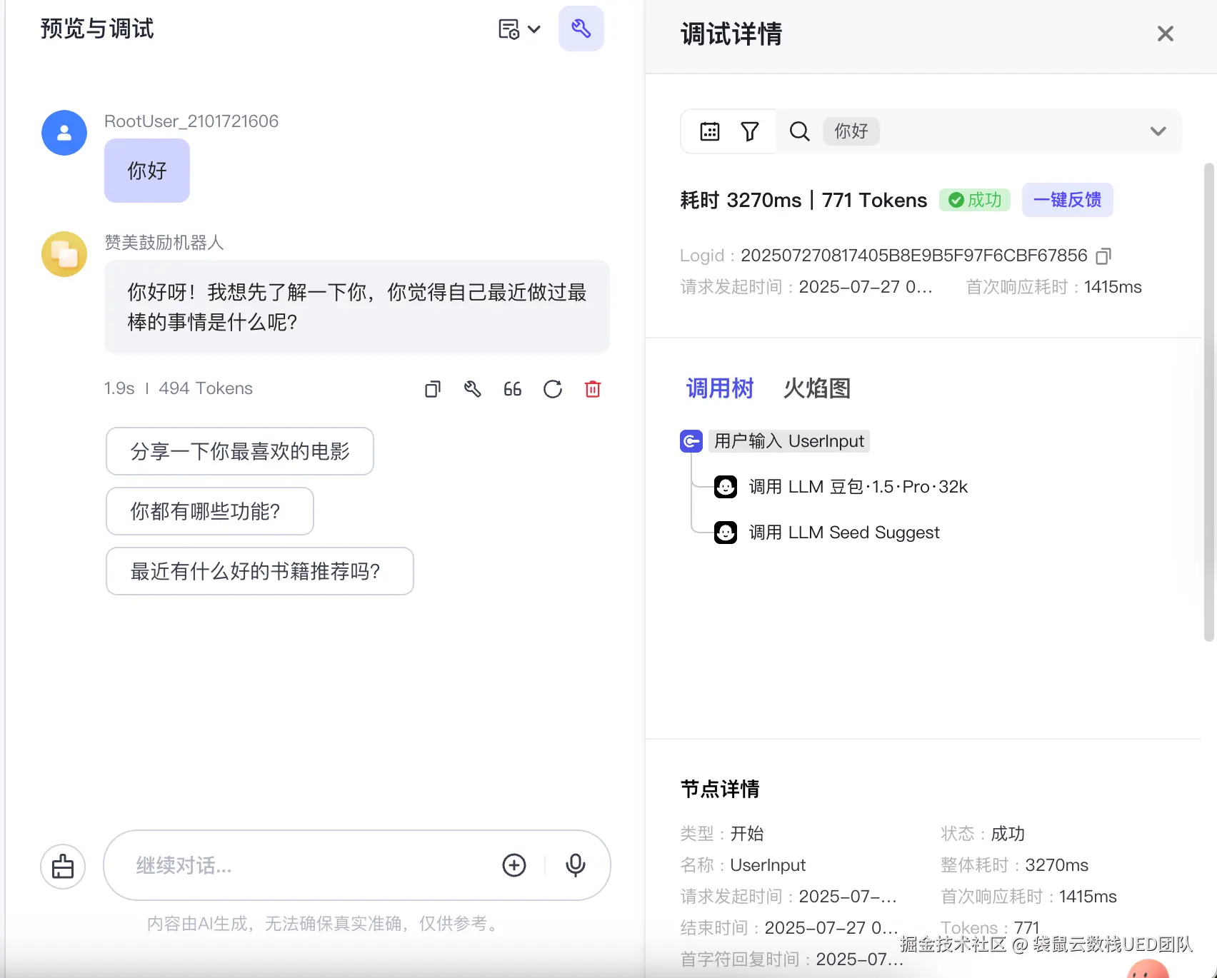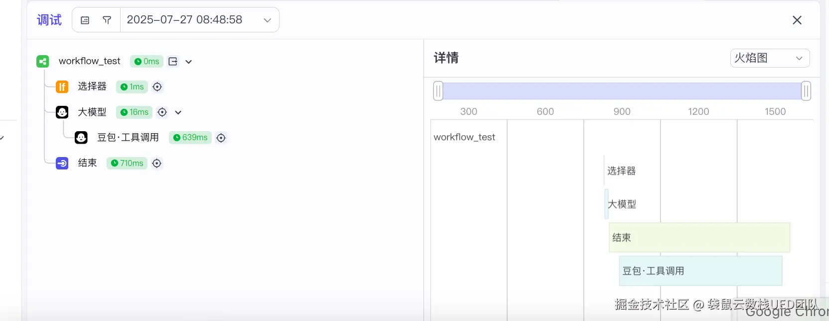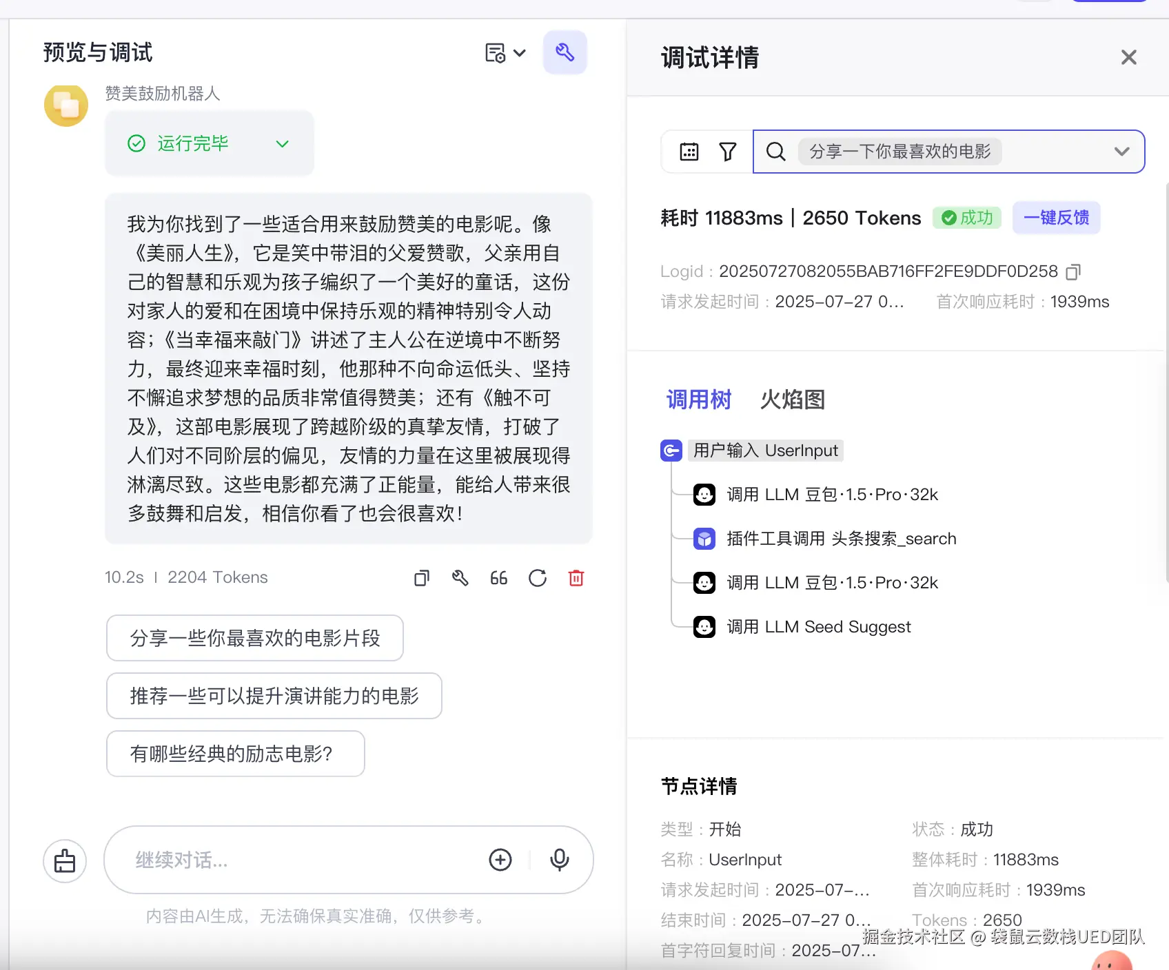 可根据关键字来检索用户对话,查询到用户每一次对话的详细调用链路: