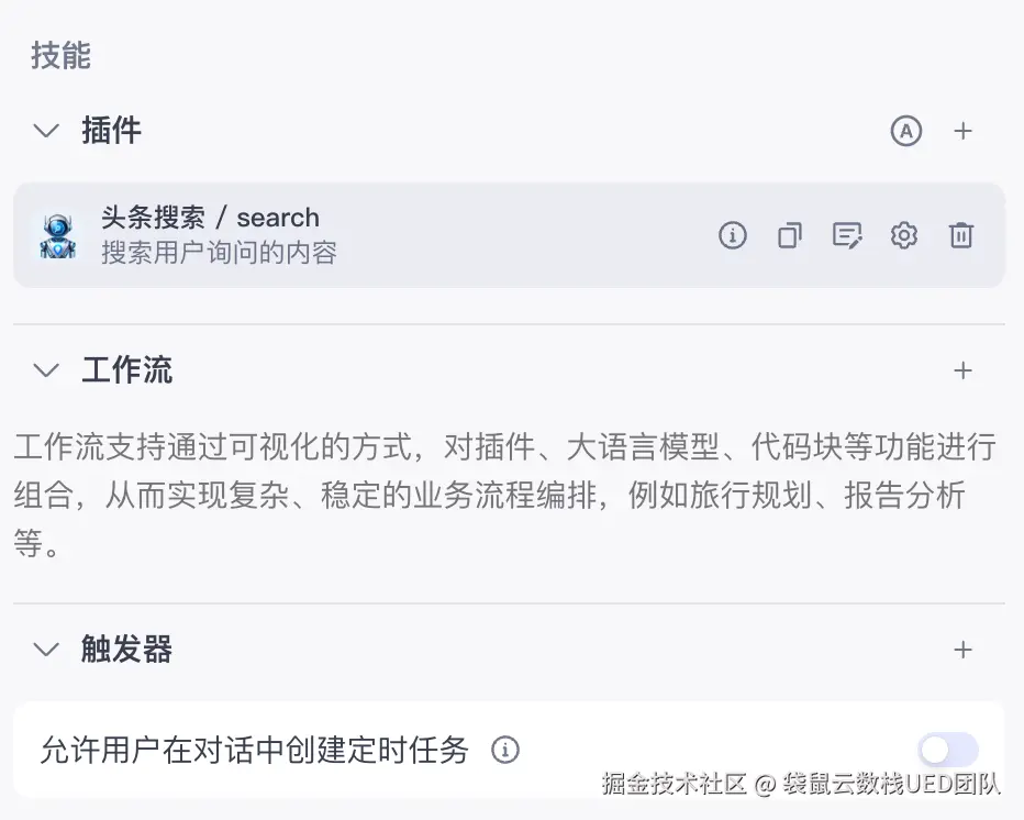 技能方面: 支持添加插件、工作流、触发器(支持创建定时任务)