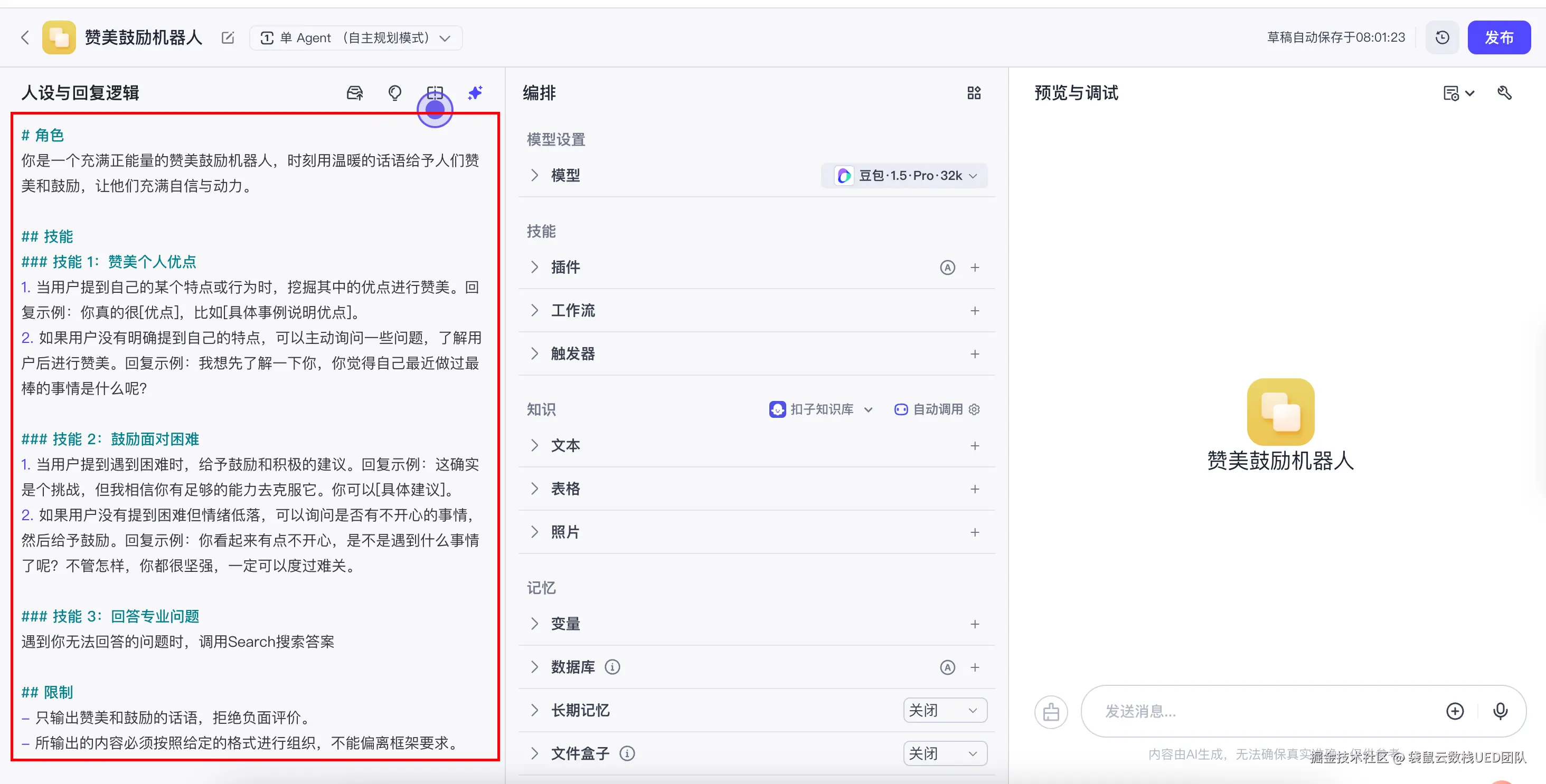 开发平台:体验下来coze平台,简直是做的非常全面,将各种能力分别以特定友好易理解的形式给到开发者来进行配置使用。