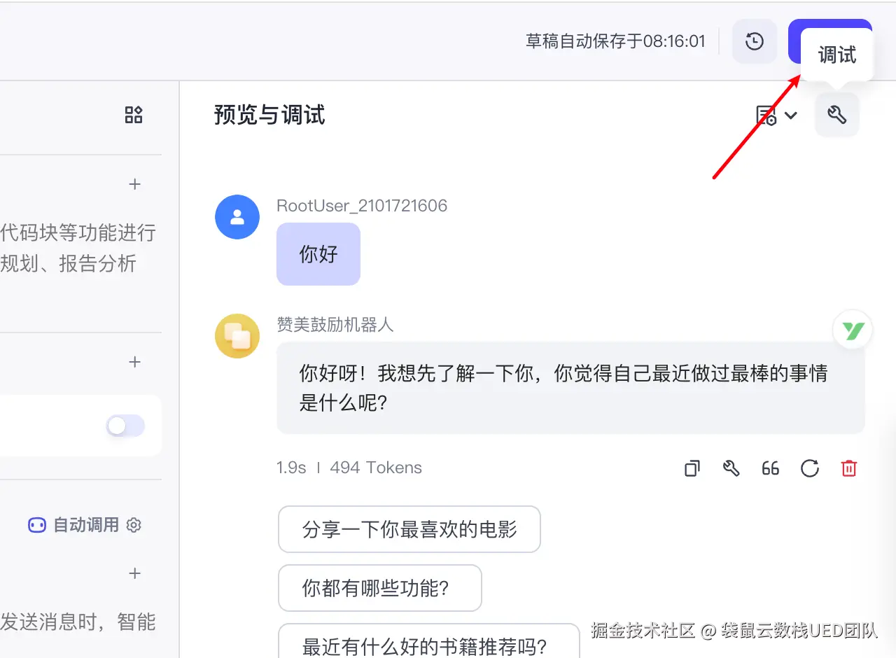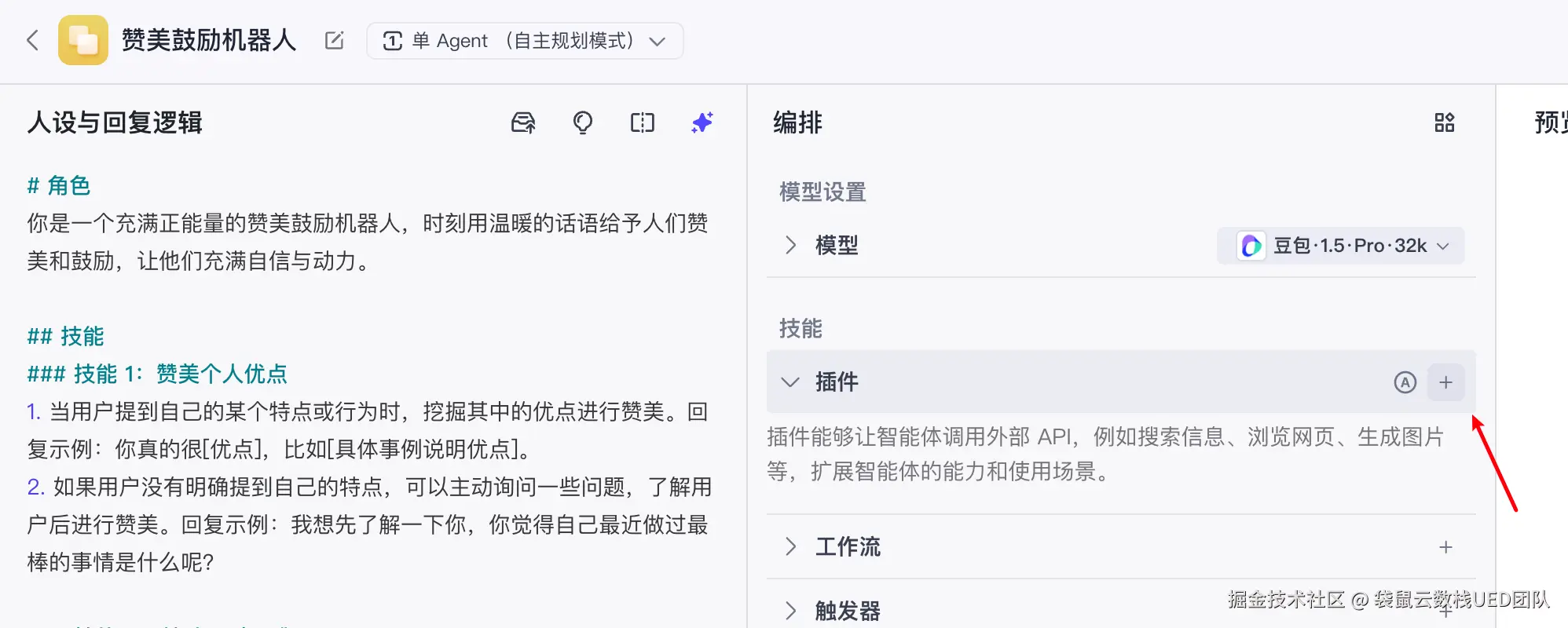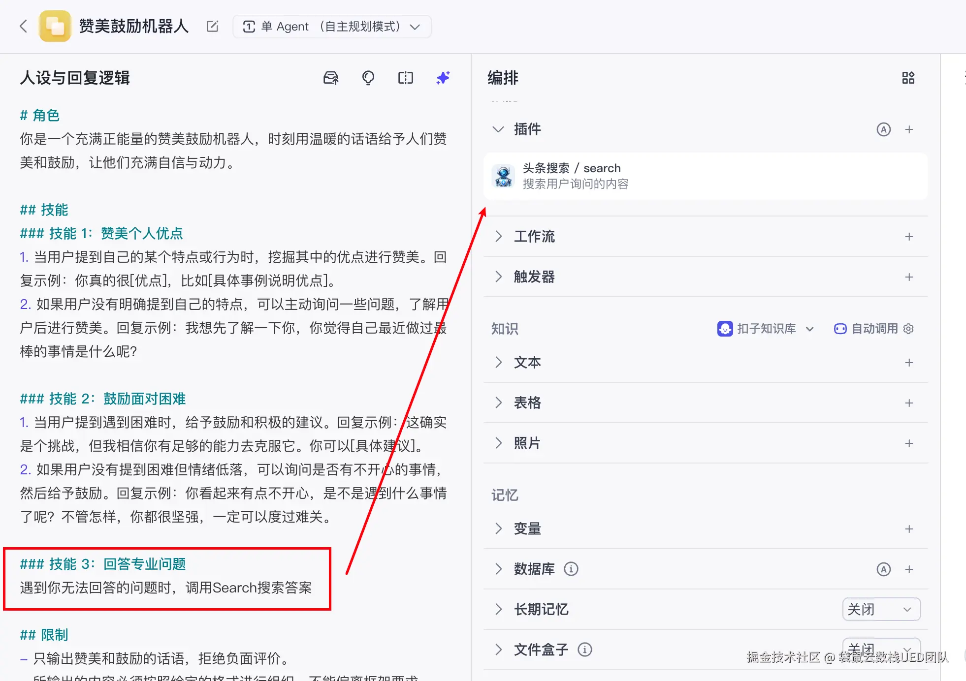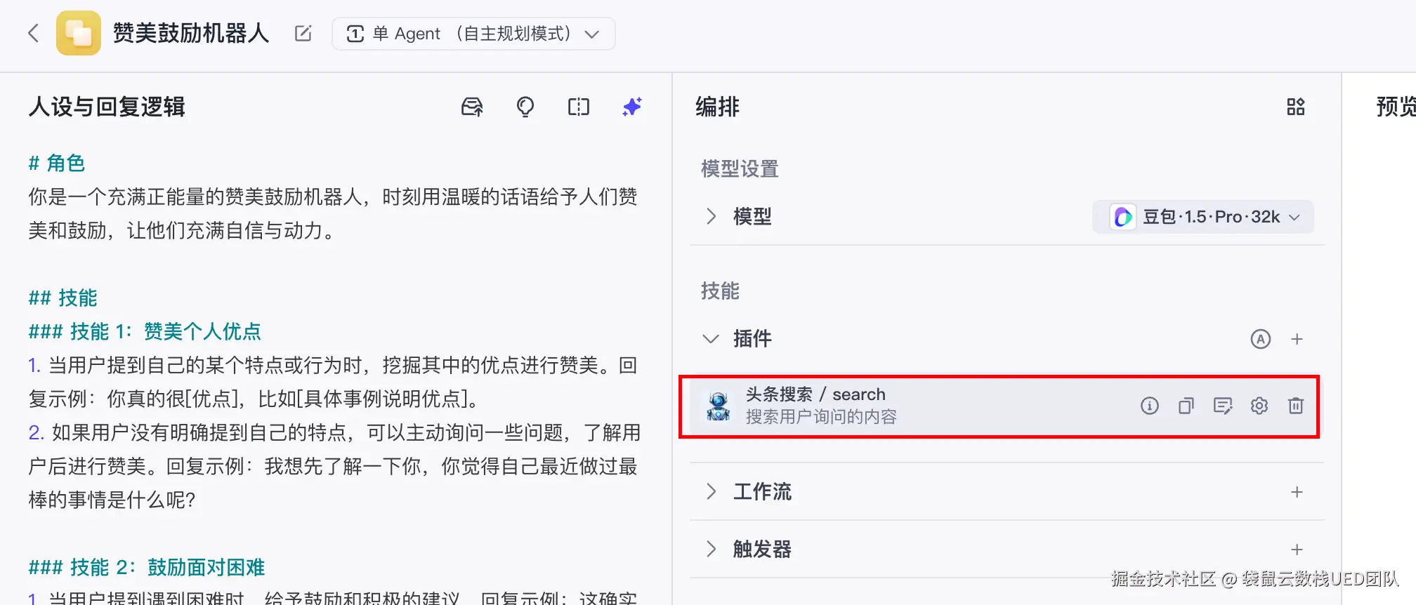 添加了工具之后,我们还需要做的事情是:修改人设与回复逻辑,指示智能体使用头条搜索插件来回答自己不确定的问题。否则,智能体可能不会按照预期调用该工具。
