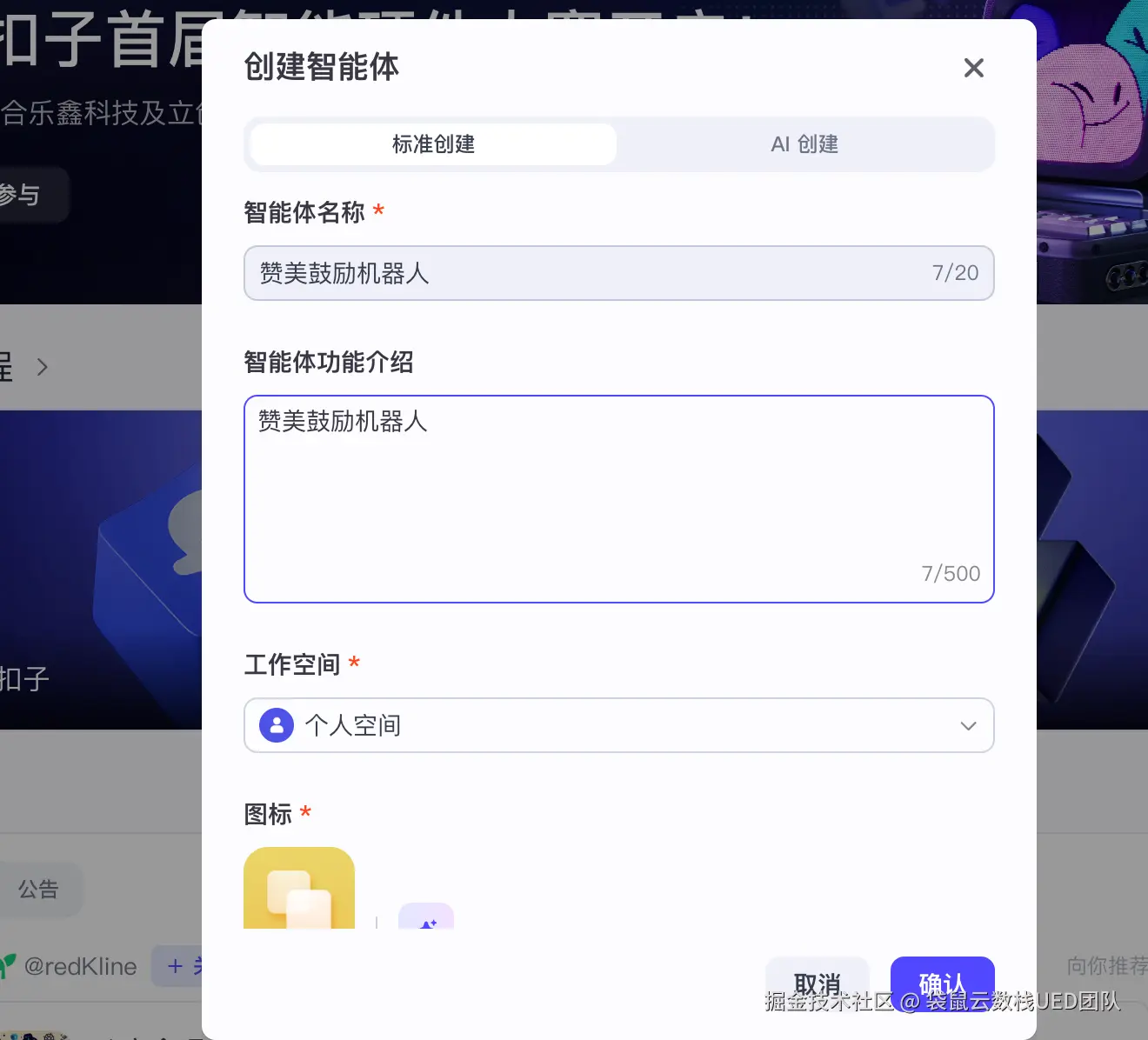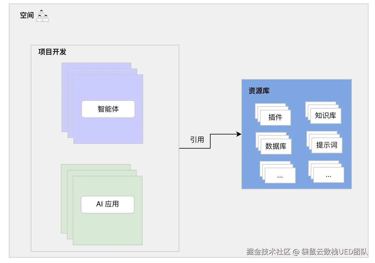 - 空间:空间是资源组织的基础单元,不同空间内的资源和数据相互隔离。一个空间内可创建多个智能体和 AI 应用,并包含一个资源库。在资源库中创建的资源可以被相同空间内的智能体和 AI 应用使用。