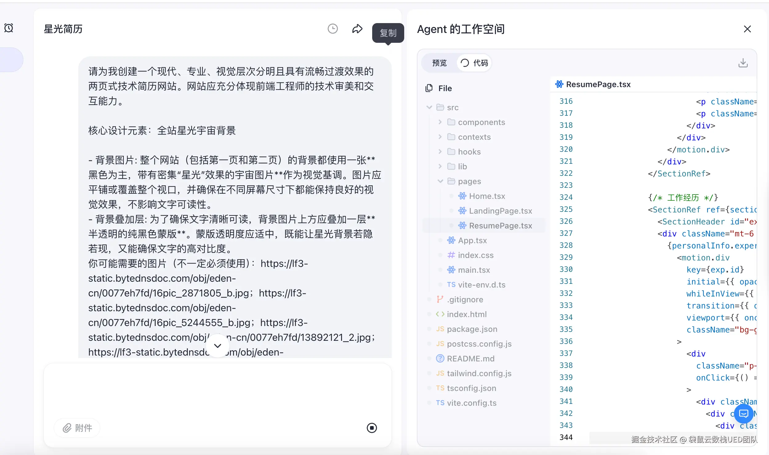 - 页面底部正中间应有明确的“进入简历”或“了解更多”的指示(例如,一个指示性箭头或按钮),点击后平滑滚动或切换到第二页。该指示元素也应使用星光色。