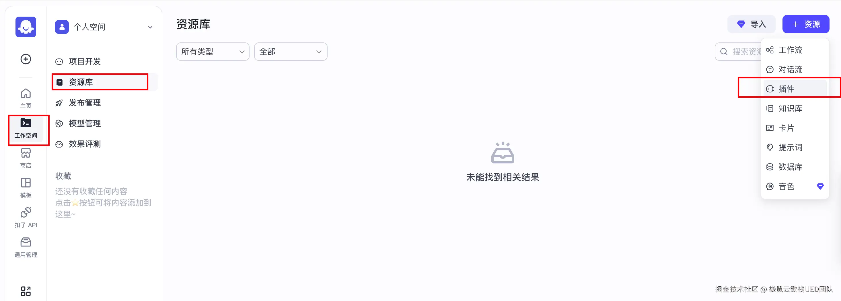 - 资源库:你可以在资源库内创建、发布、管理共享资源例如插件、知识库、数据库、提示词等。这些资源可以被同一空间内的智能体和应用使用。