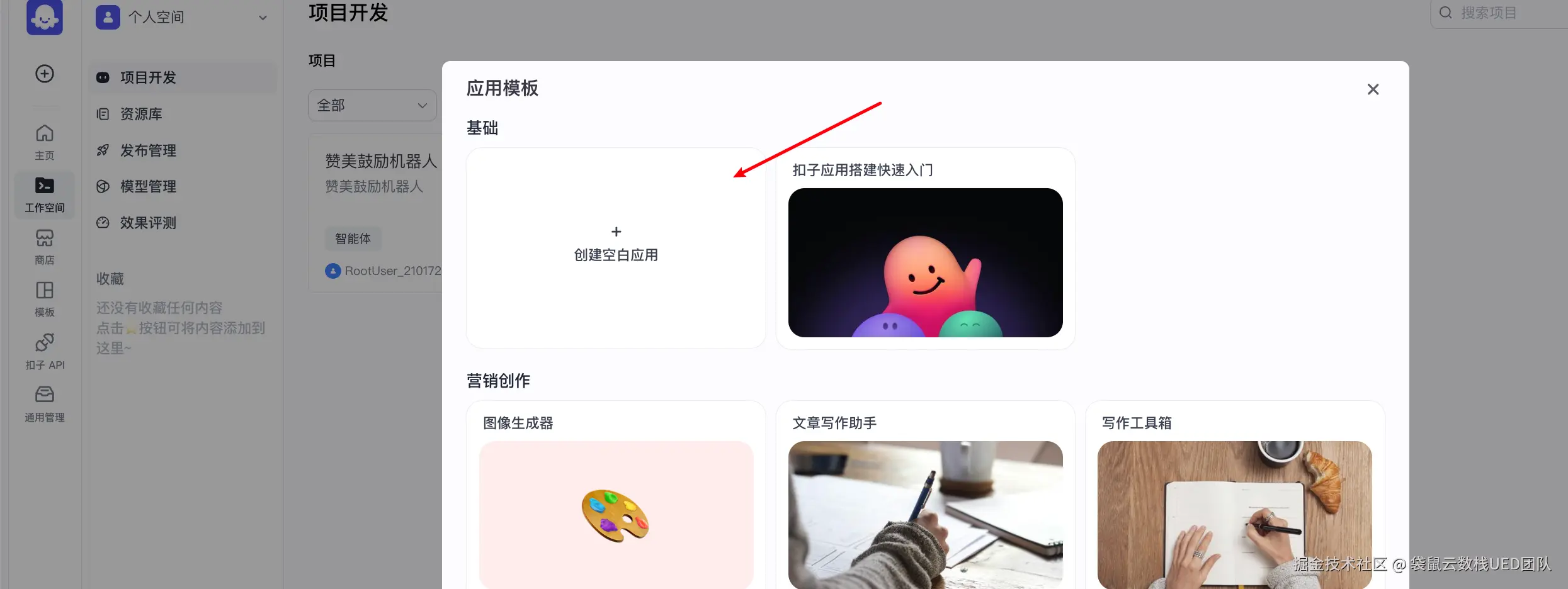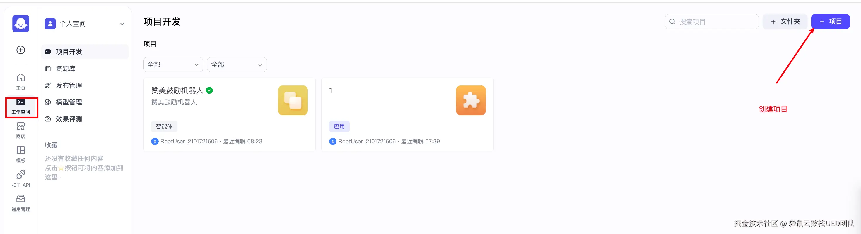- 项目:项目分为智能体和 AI 应用两种类型,AI 应用内可以创建多种应用专属资源,也可以和智能体共享空间资源库中的资源。