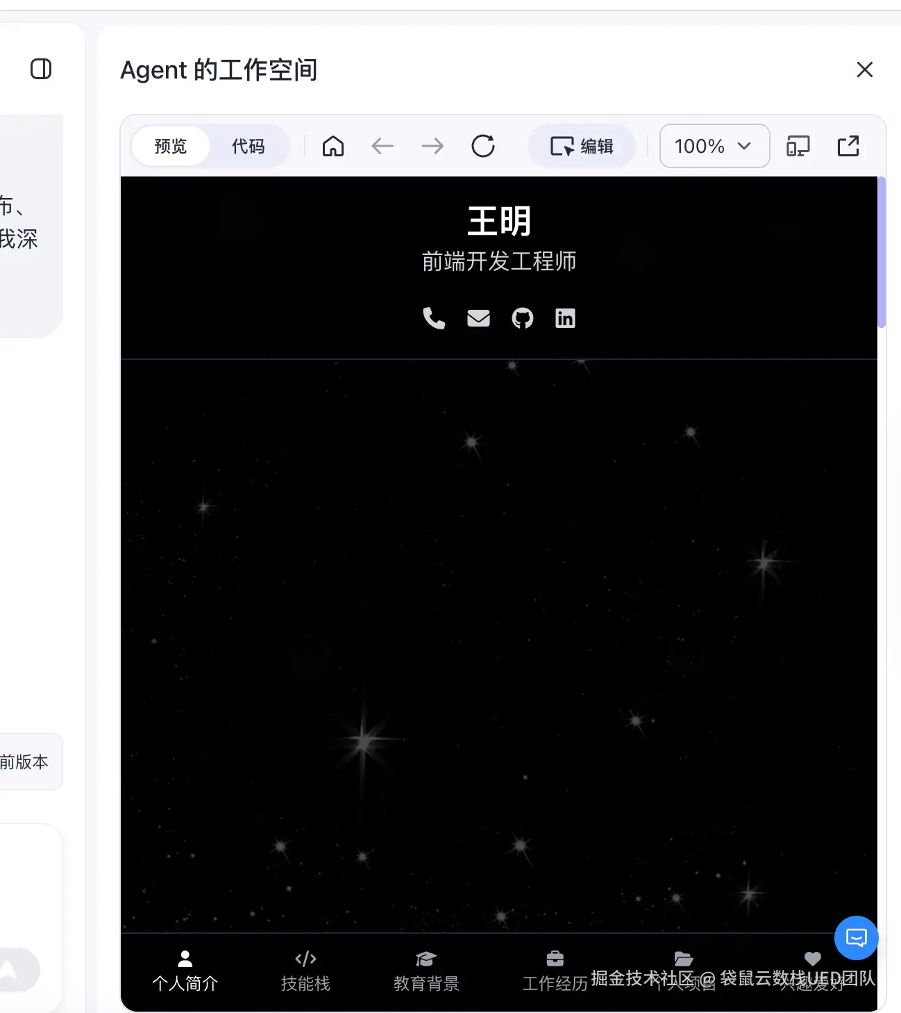 - 内容区域背景: 为了突出内容,详细简历区域(左右分栏的卡片和文字)的背景应采用**半透明的深灰色或略带星光感的深黑蓝色**(例如:#282828 或 #333333,带有轻微的模糊或磨砂效果),与背景渐变形成层次,突出内容。这些内容区域的背景应确保与星光背景有区分度,但又融入整体。