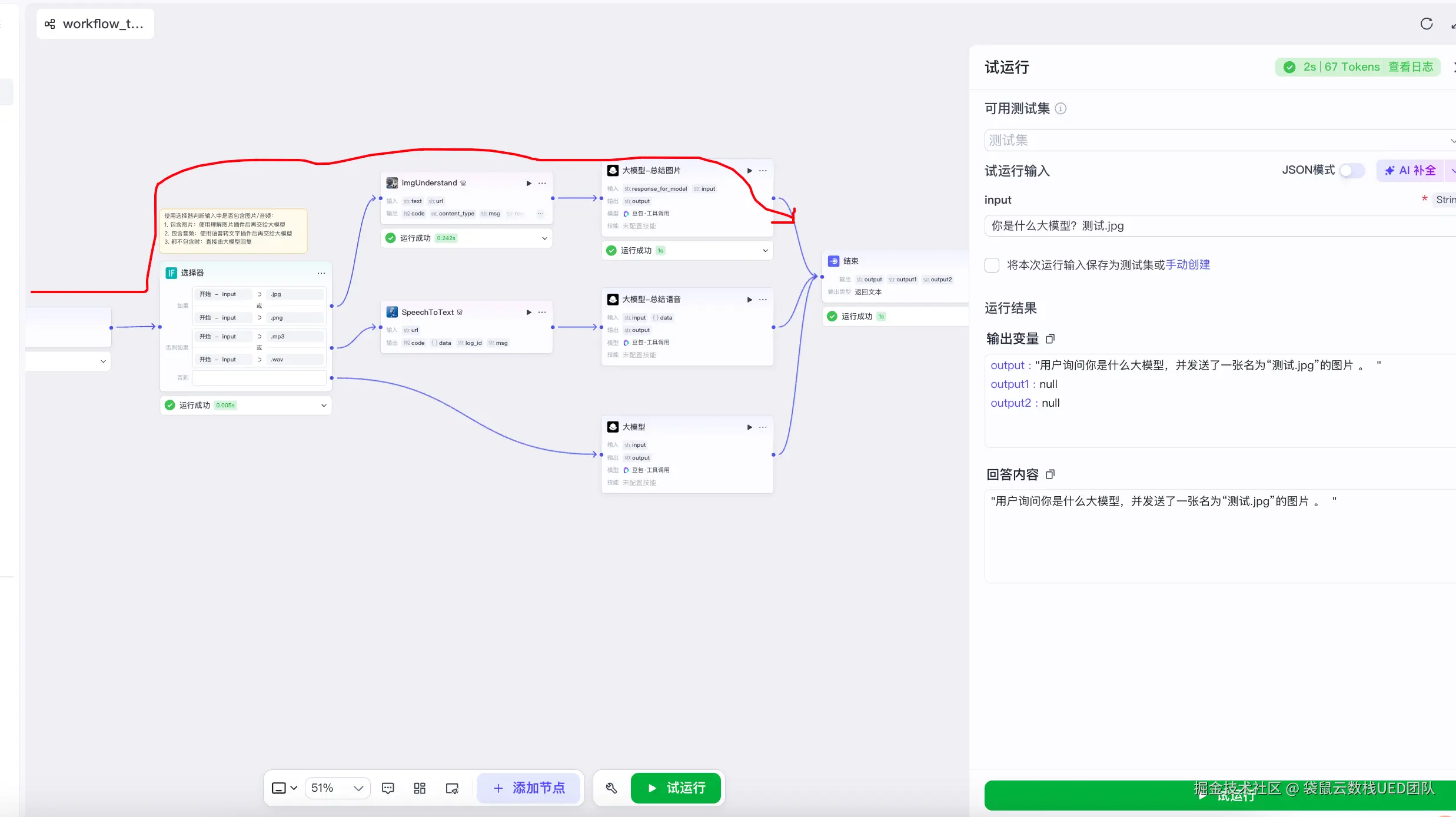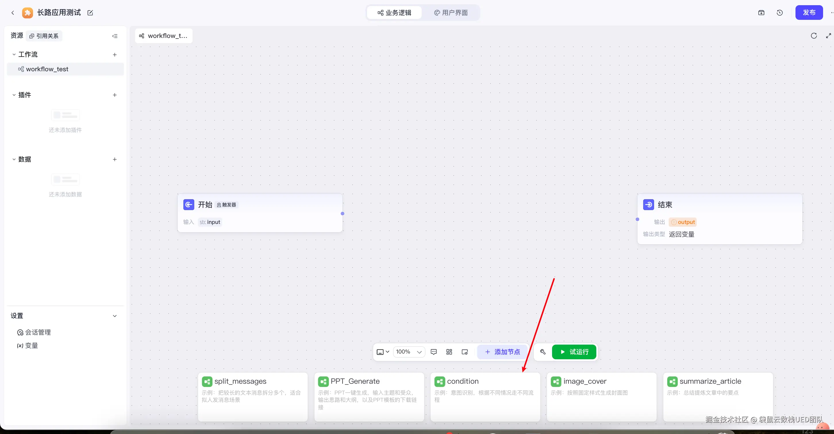 扣子提供了一个可视化画布,你可以通过拖拽节点迅速搭建工作流。同时,支持在画布实时调试工作流。在工作流画布中,你可以清晰地看到数据的流转过程和任务的执行顺序。