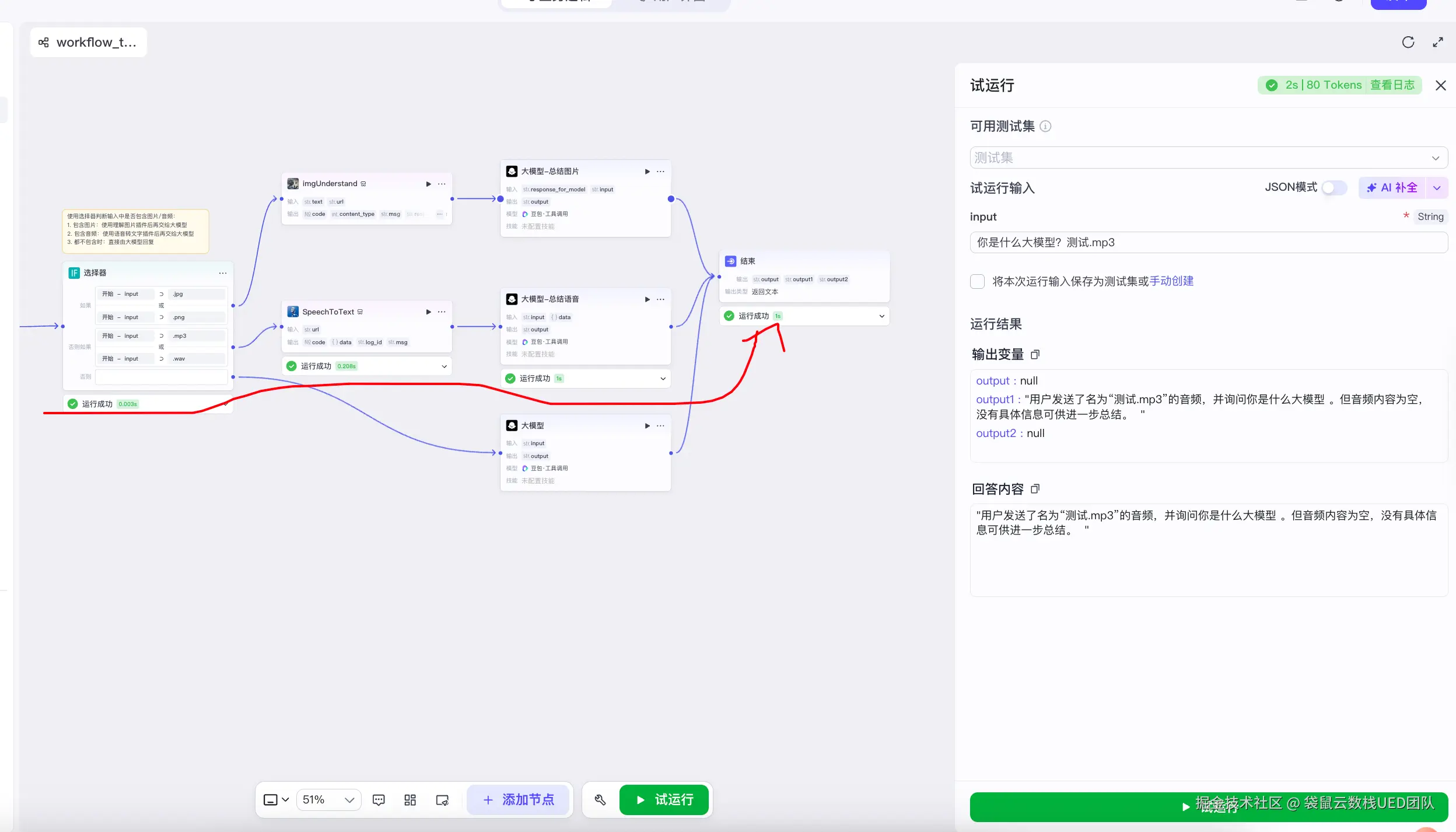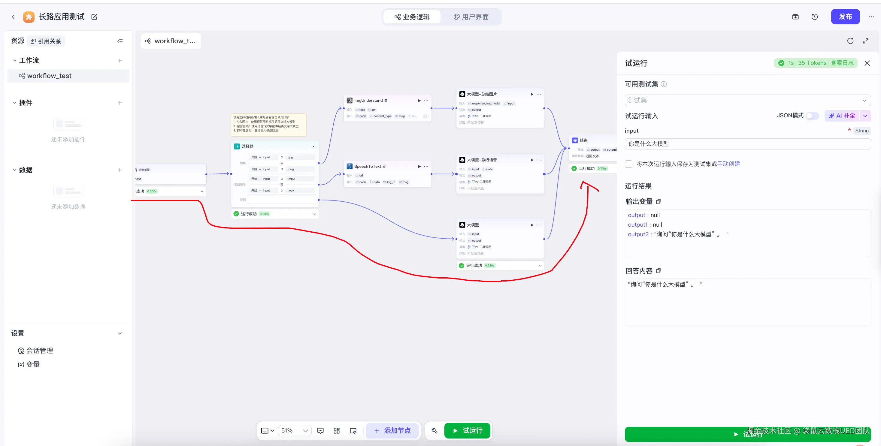 通过引用节点输出,你可以将节点连接在一起,形成一个无缝的操作链。例如,你可以在代码节点的输入中引用大模型节点的输出,这样代码节点就可以使用大模型节点的输出。在工作流画布中,你可以看到这两个节点是连接在一起的。