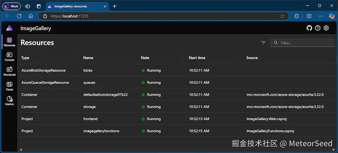 集成不仅止步于设置。运行或调试带有 .NET Aspire 支持的 Azure Functions 项目将在浏览器中启动 .NET Aspire 仪表板。这个强大的工具允许您实时监控 Azure Functions 的执行。您将确切地看到 . NET Aspire 编排器是如何管理您的函数的,并且您将能够直接从仪表板暂停和恢复执行。