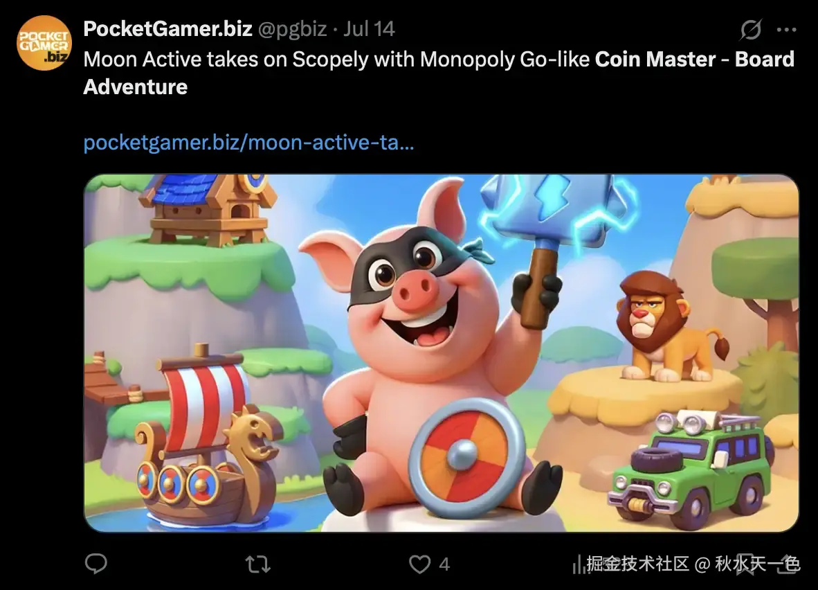 更具戏剧性的是,这场较量并未就此落幕。当【MONOPOLY GO!】大放异彩时,Moon Active 选择蛰伏两年,带着新作【Coin Master-Board Adventure】重返战场——这一次,它将目光投向了【MONOPOLY GO!】赖以成功的大富翁玩法,用以彼之道还施彼身的方式,摆出了正面迎战的姿态。
