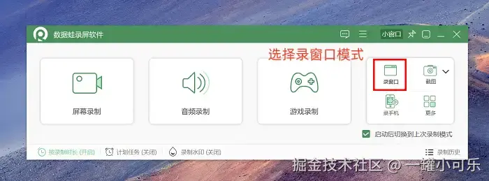 第1步:启动数据 蛙录屏软件并进入主界面,之后点击右侧的 “窗口录制” 模式就行,这个模式可以用来录制QQ窗口。