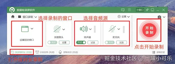 第2步:进入窗口录制模式后,可以在首个选项框中对录制窗口进行调整,随后挑选合适的音频源。如果有需求,还能开启 “按时长录制” 功能。待所有设置完成,点击 “开始录制” 按钮就能开始录制视频了。