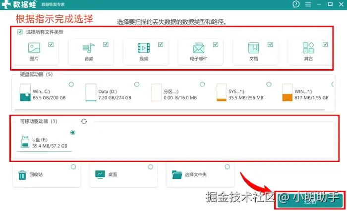 步骤1: 进入软件首页后,在指定的位置上选择自己需要恢复的文件类型,再勾选上进行扫描的移动硬盘,按下按键让其开始扫描工作;