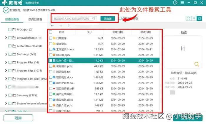 步骤2: 扫描完成后,在指定位置上根据软件一并扫描出来的文件信息,筛选出自己需要恢复的文件,按下【导出】;