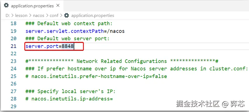 如果无法关闭占用8848端口的进程,也可以进入nacos的conf目录,修改配置文件中的端口: