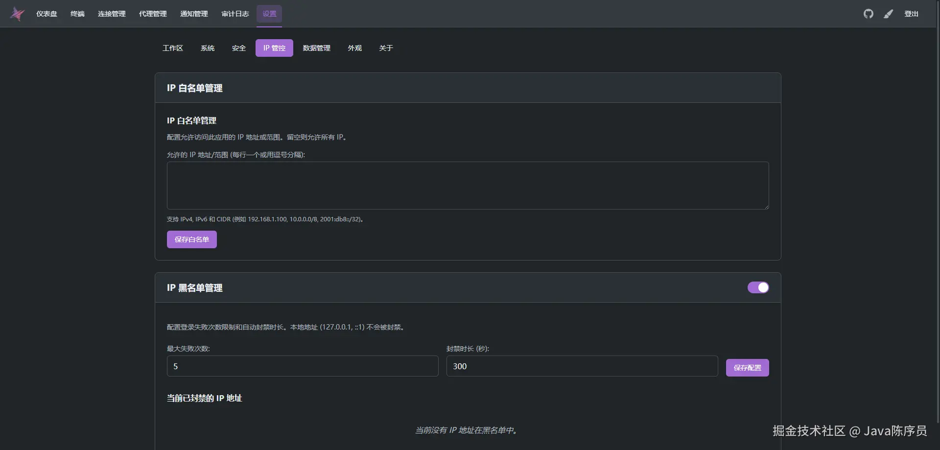 - 完备的安全机制:集成多重登录安全机制,包括人机验证(hCaptcha、Google reCAPTCHA)与双因素认证(2FA),同时支持 IP 白名单与黑名单,异常访问自动封禁,以及审计日志全面记录用户操作