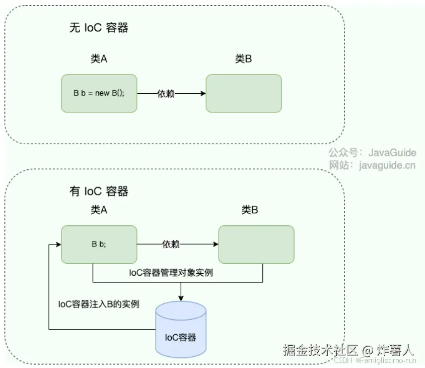 - 传统的开发方式 :往往是在类 A 中手动通过 new 关键字来 new 一个 B 的对象出来