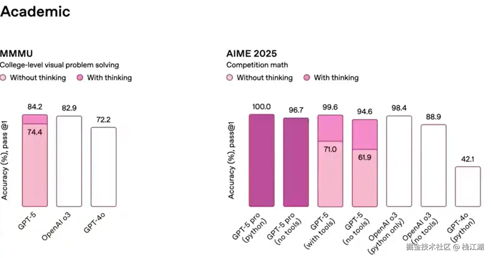 GPT-5 在数学领域的新突破 GPT-5 在数学方面的表现比前代模型更为强劲,尤其在复杂推理和高难度题目处理上展现出“博士级”智能。