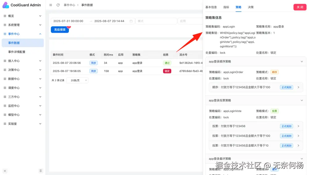 另外很重要的一点,如果你看了前面的示例代码,其实这笔也是跑所有的策略规则的,在测试中这两笔结果是一模一样的,只是最终结果取的是事件结果而不是策略结果,这也是保留灵活性和审查策略运行的一种方式吧。