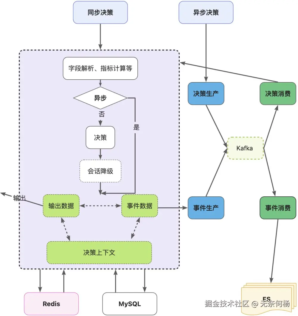 下面这张图大致说明了现在的同步/异步决策流程,带上Kafka生产消费和决策中的上下文、事件数据、输出数据等概念。后续有时间再介绍整个架构和数据流的设计和实现吧😂