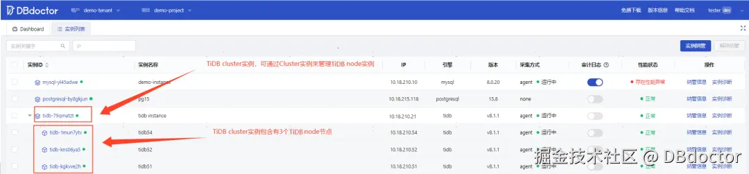 连通性检测通过后,点击提交后即可成功纳管TiDB数据库。在实例列表界面,可以看到已纳管的TiDB cluster实例及TiDB node实例信息。此时,性能洞察已开启,开始体验DBdoctor的强大吧!