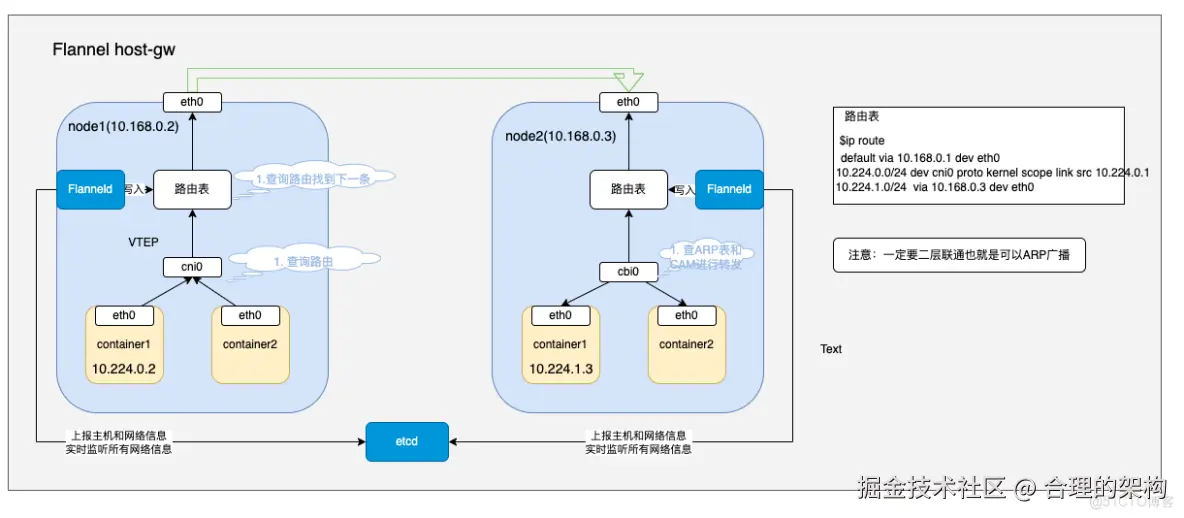 - 节点使用路由表将流量转发到其他节点的 Flannel 网关(即选定的宿主机)。