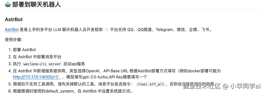 - 部署链路:模型输出风格化回复,可选择合成语音 → 接入聊天平台机器人端