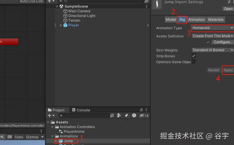 1.首先选中跳跃动画 -> 点击右侧菜单栏的“Rig”-> 在Animation Type的下拉框中,选择“Humanoid”(把动画设置成人形)-> 最后点击“Apply”应用即可。