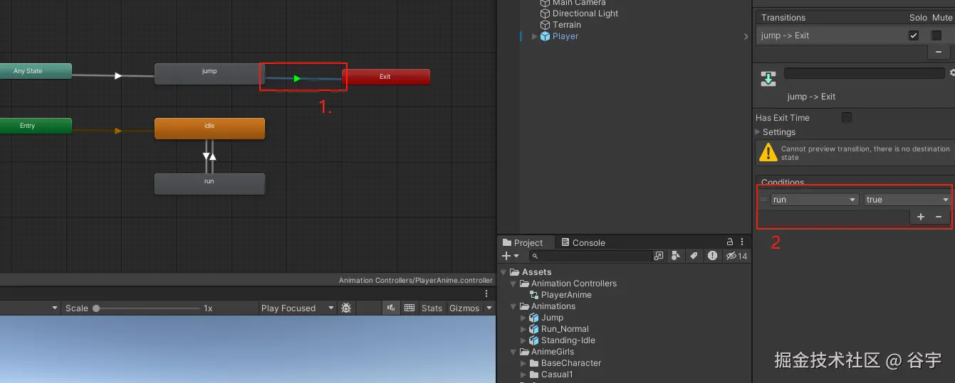 5.点击选中跳跃动画和“Exit”之间的过渡线 -> 在右侧菜单栏的“Conditions”条件列表中,添加Bool变量“Run”,并且值为“true”(这里是在跳跃动画结束后,重新让动画器激活跑步动画,使动画器不会因为去到“Exit”节点而结束)。