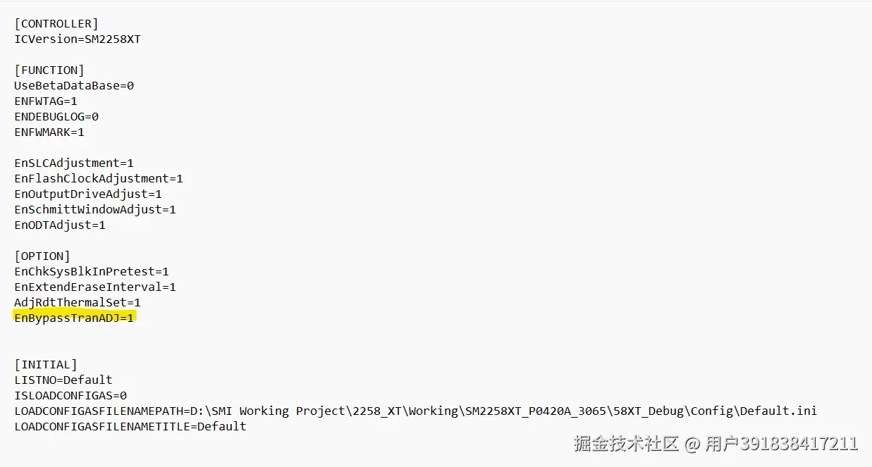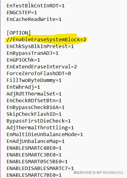不管了,先开卡。不出意外,还是报TranADJ错误,看来这个工具根本就不支持忽略TranADJ,这下完蛋了!我试着降低Flash Clock,从200MHz一路试到25MHz也没有用,此时我黔驴技穷,一时没了办法。再次检查板子,发现Toggle跳线是空的,但是颗粒是带狗颗粒,于是补上10K电阻,再次开卡,顺利过TranADJ,但是又卡在了Dump System Block不动了,这不是坑爹嘛!此时我黔驴技穷,一时没了办法。于是前往量产部落下载其他的开卡包随便翻了下Setting.set,结果发现一个有意思的地方: