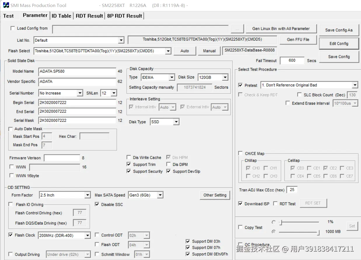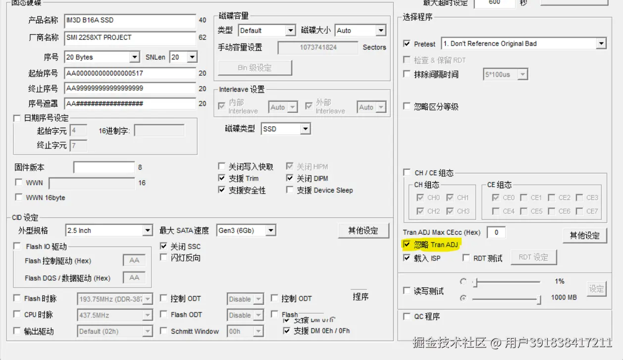 重新打开从量产部落下载的开卡工具,看了一眼设置,还是没有忽略TranADJ选项,理论上添加了参数之后应该会出来这个选项的,就像这样: