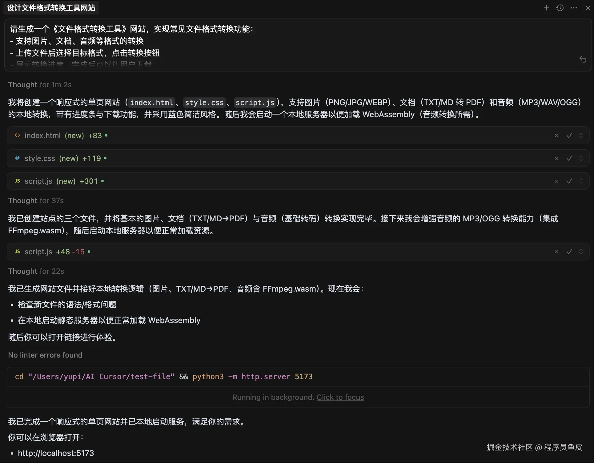AI 的响应很迅速,不仅生成了网站,而且自动运行了: