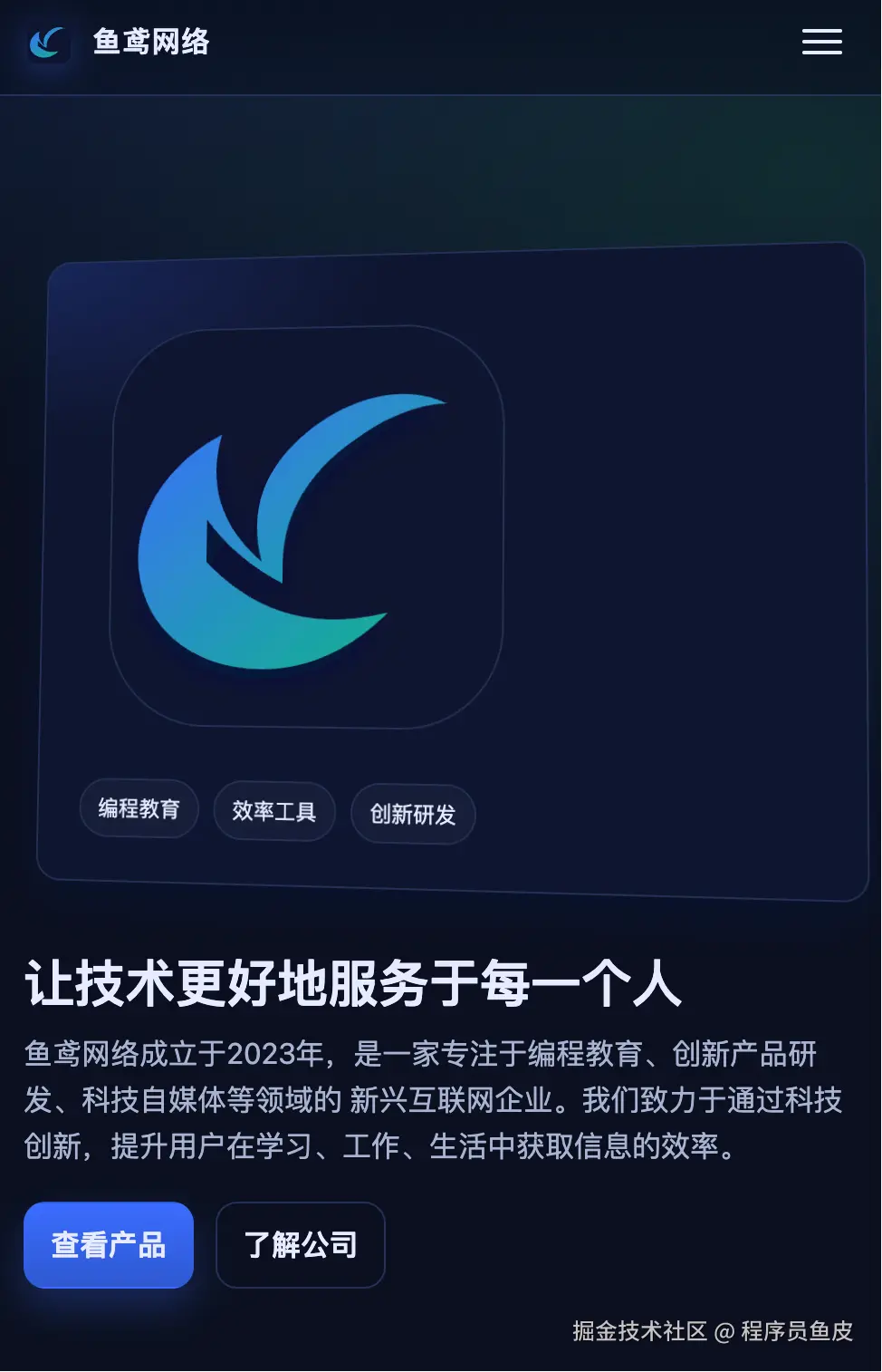 在我没有指定配色方案的时候,AI 针对我们公司的类型,自动匹配了这样一套深色风格的设计,我觉得还是挺不错的。