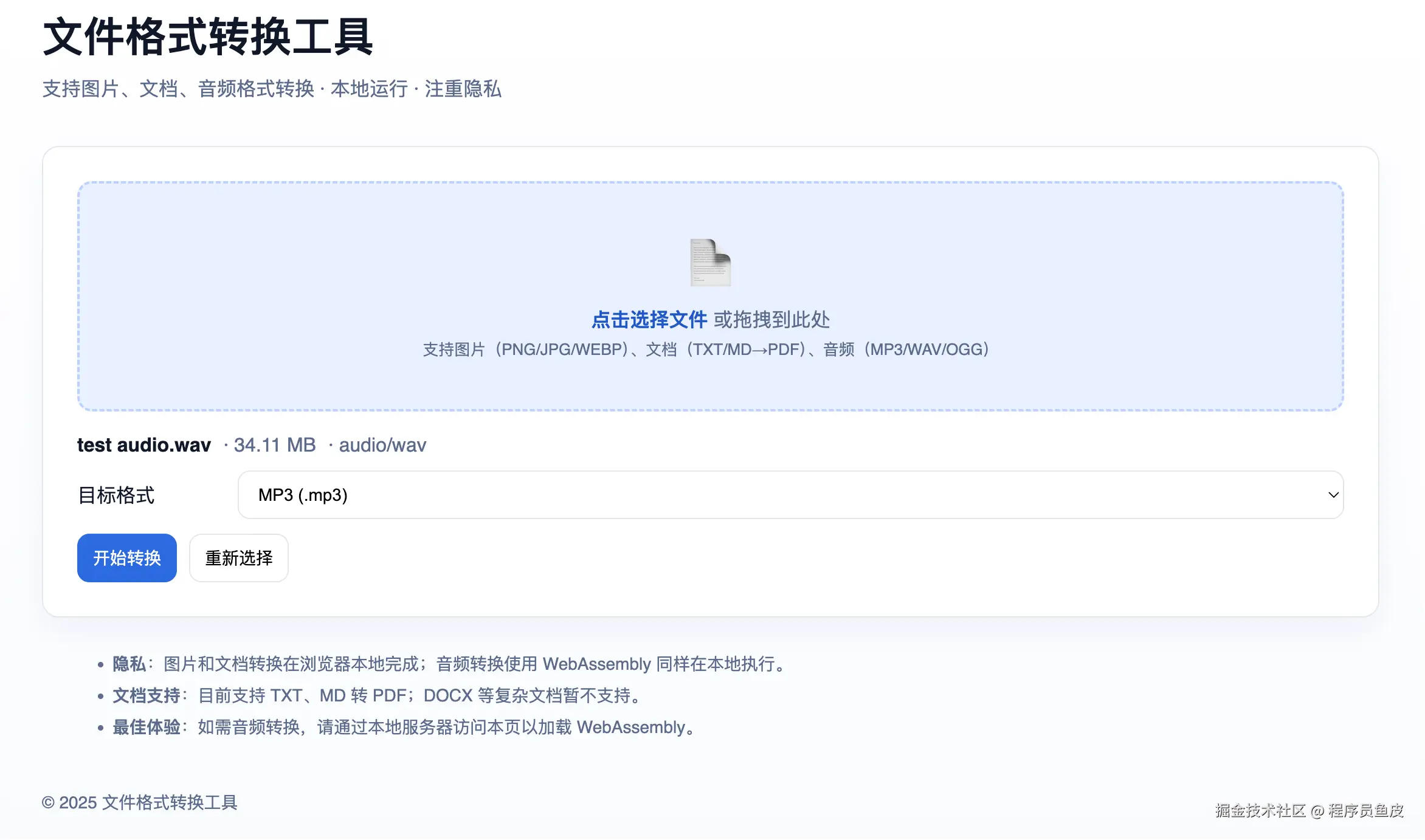 再看一下 GPT-5 的生成效果,其实样式上跟 Claude 生成的区别不大,但是它是真的能进行音频、PDF 文档的转换!不像之前 Claude 生成的转换工具,可能只是改了个文件后缀。