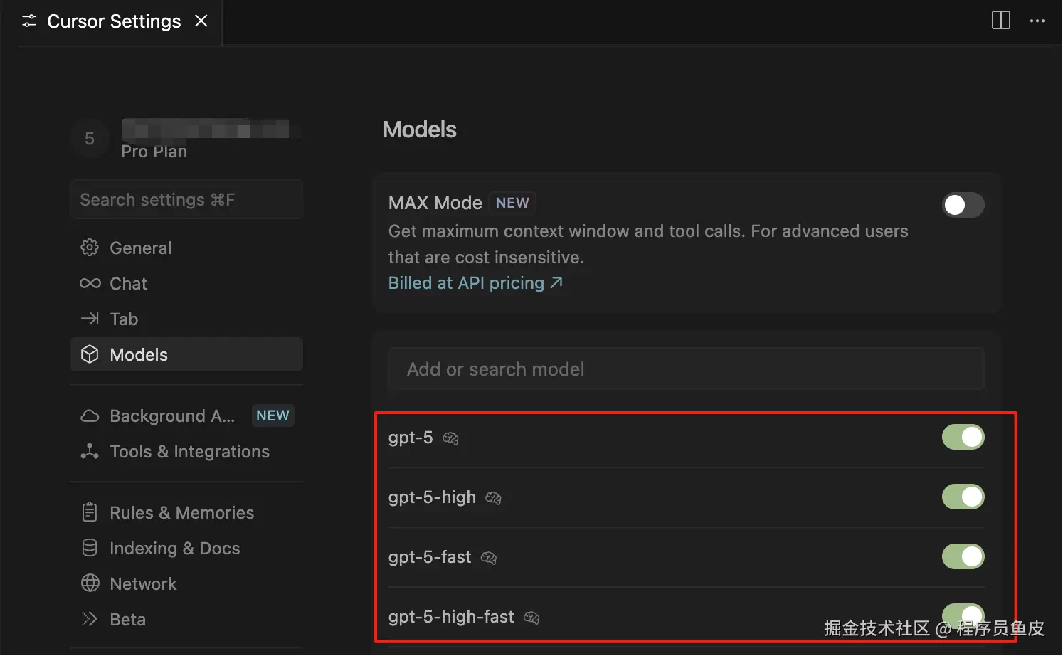 首先进入 Cursor 设置,把 GPT-5 的模型都选上:
