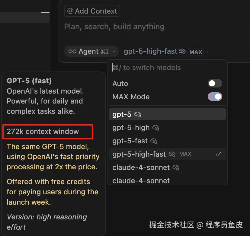 对话时就可以选择了,建议用 gpt-5-high-fast,又快又好,而且上下文长达 272k,AI 能同时接受理解的信息更多了。