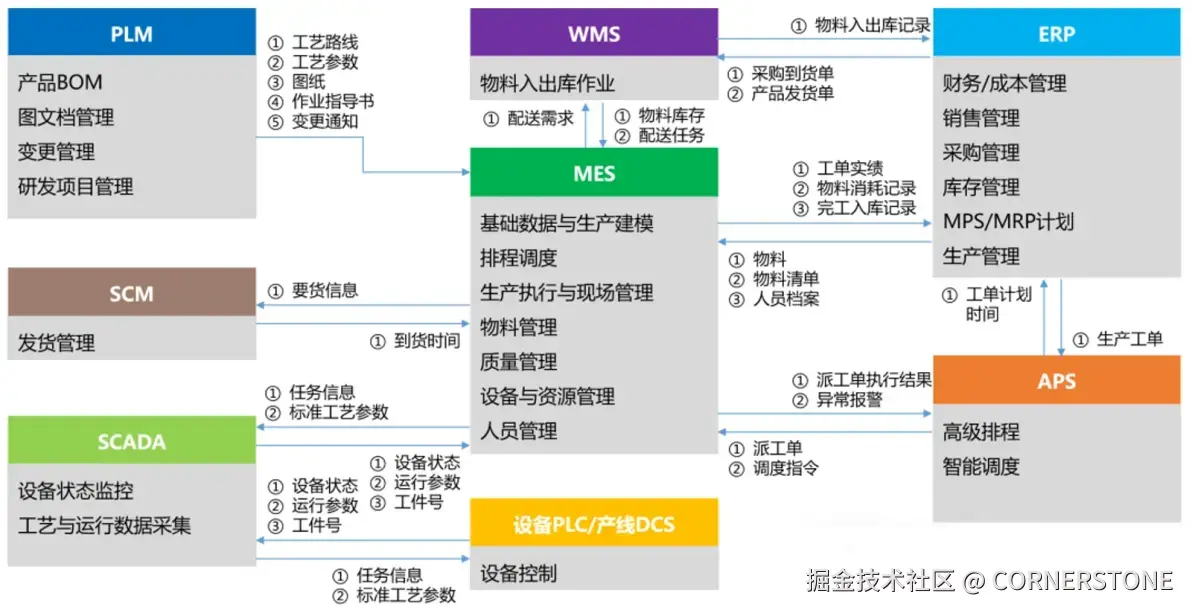 ERP 是企业的中枢,负责整合财务、人力资源、生产、供应链、销售等信息。它与 MES、WMS、SCM 等系统集成,获取生产现场实时数据、库存信息和供应链状态,实现企业资源的有效规划与管理。