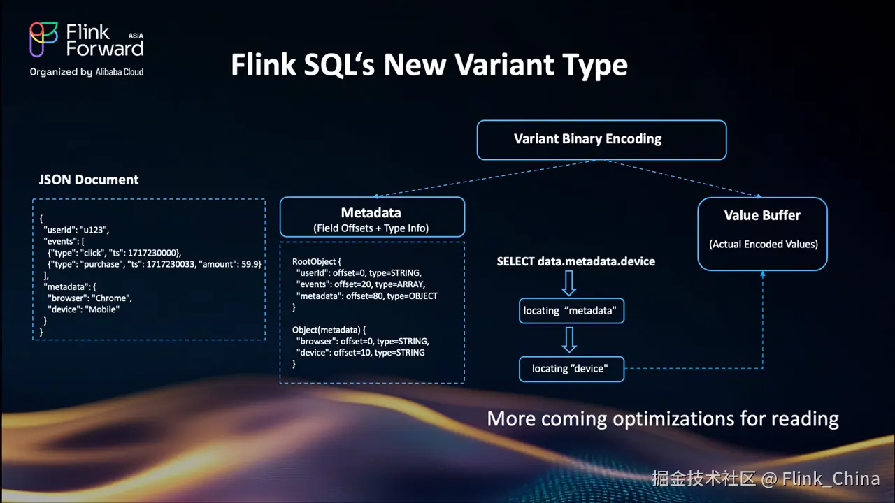 Flink 2.1 引入了新的VARIANT类型,这是一个原生的、二进制编码的半结构化类型。与普通的JSON字符串不同,VARIANT以结构化方式存储元数据和值。因此访问data.metadata.device只是一个直接的偏移查找,不再是完整的解析。