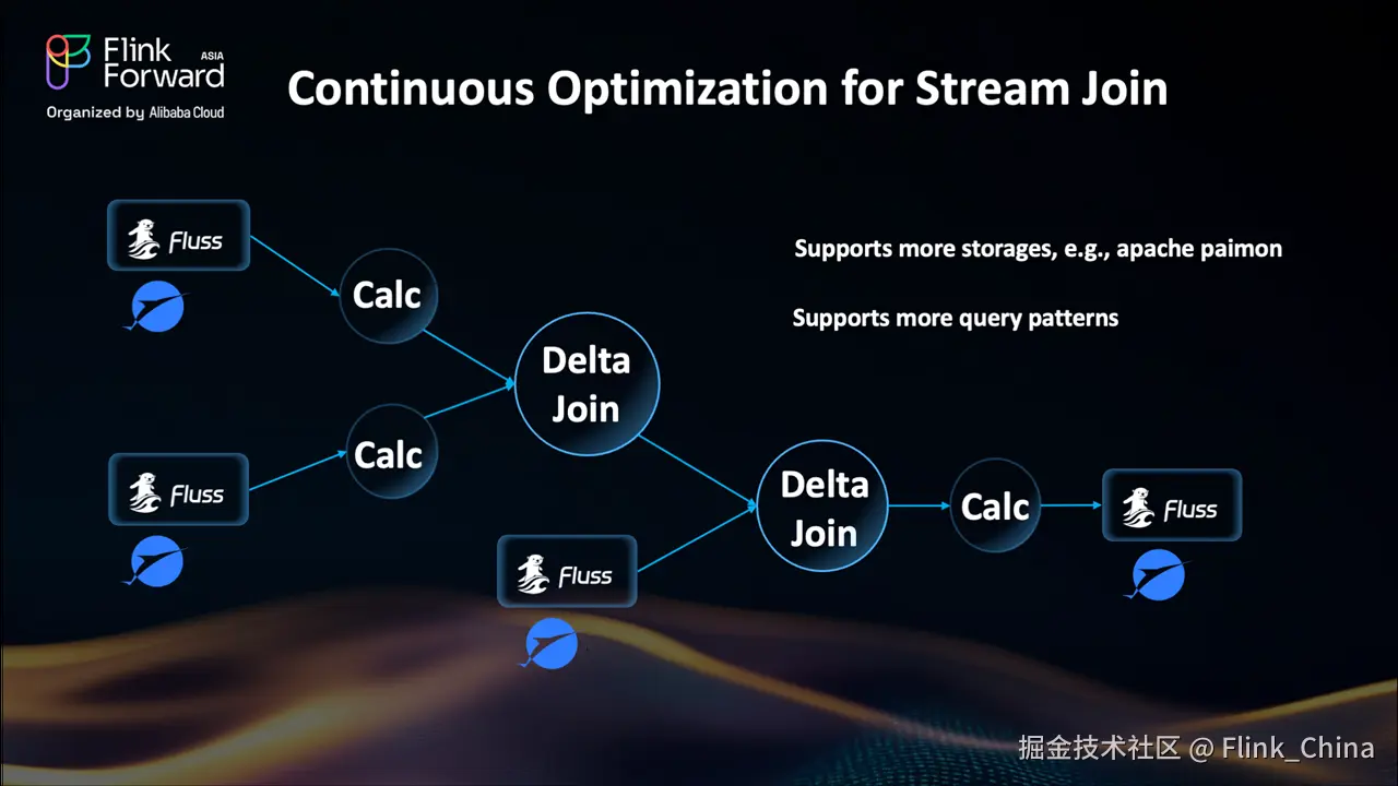 Join 性能始终是流式计算的核心课题。Delta Join 已通过解耦了 Flink Task 与本地状态的强绑定,有效解决了大数据量 Join 的扩展性难题。未来,我们将进一步支持更多存储引擎(如 Apache Paimon),以实现近实时 Delta Join。同时,我们也在增强对复杂多流 Join 的支持,包括: