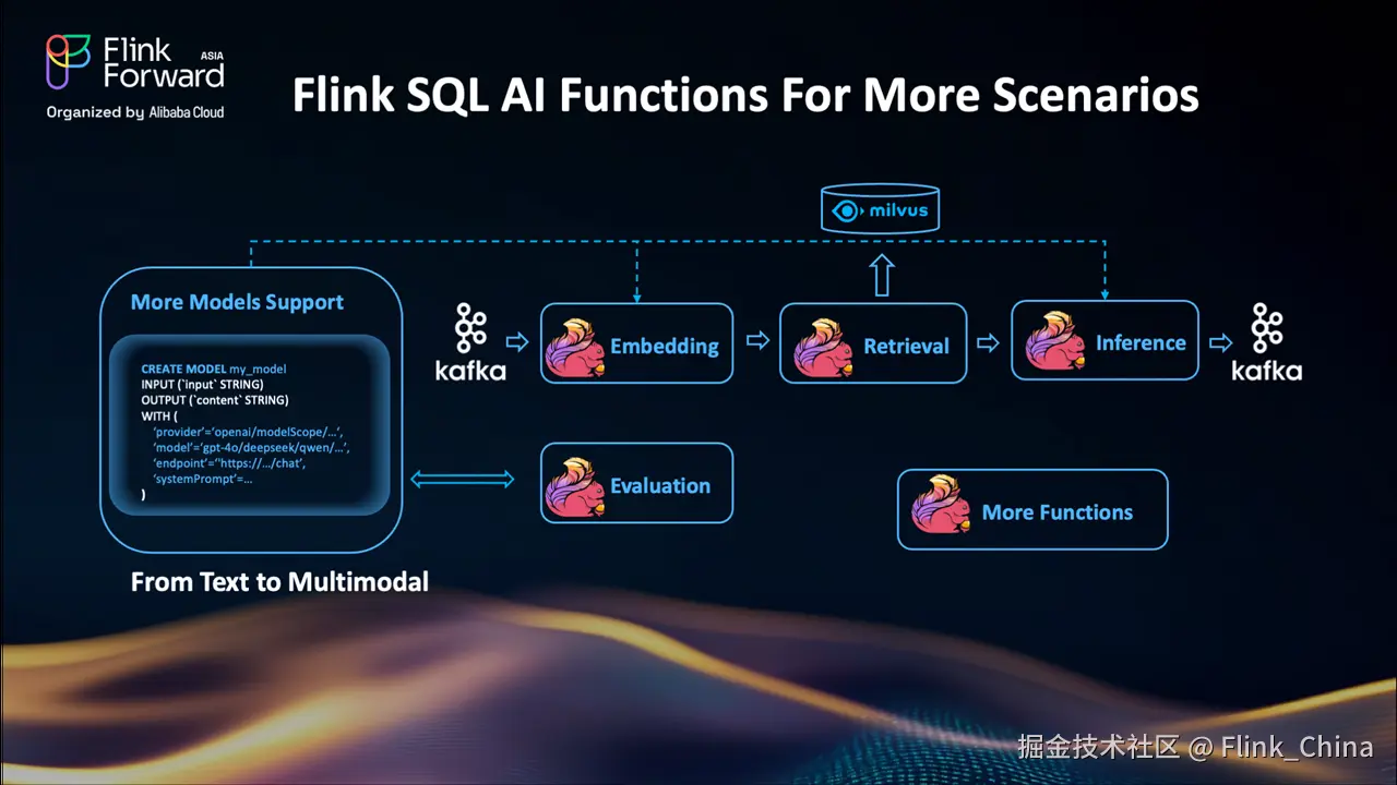 我们也在持续拓展 Flink SQL 的 AI 能力边界。除了现有的文本处理和嵌入函数,未来将支持:
