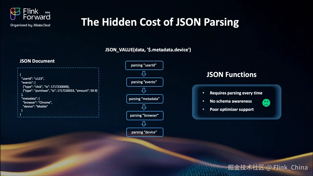 到目前为止,Flink SQL 已经支持许多内置的 JSON 函数。但随着 JSON 变得更深入和更动态,这里有一个性能挑战。
