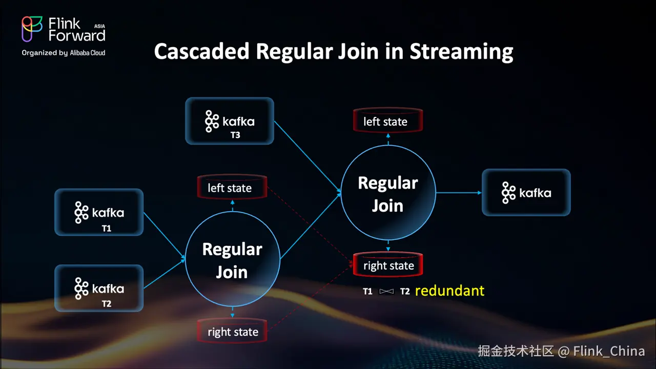 Flink 的 Regular Join 是一个二元操作:一次只能连接两条流。如果我们想关联 T1、T2 和 T3 三张表,系统必须构建一个级联式执行计划:先将 T1 与 T2 关联,再将结果与 T3 关联。