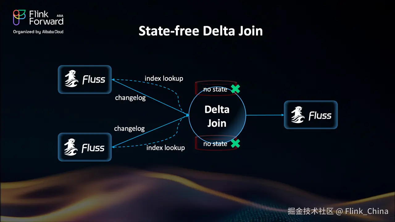 这就是 Delta Join 的用武之地——它带来了一种截然不同的设计思路。与传统 Join 方式将所有数据缓存在 Flink 状态后端不同,Delta Join 转而依赖外部存储系统(例如基于 RocksDB 构建的 Apache Fluss),将数据存于外部,实现真正的无状态计算。