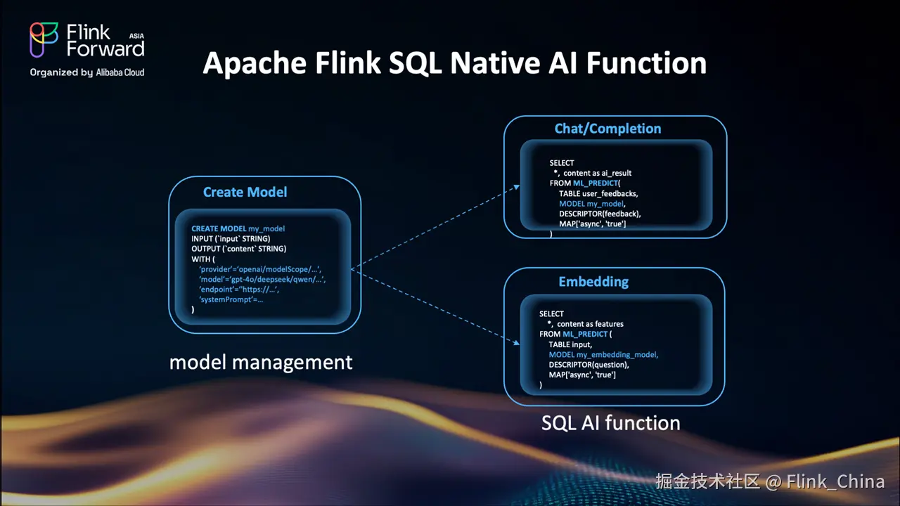 Flink SQL 融合 AI:让数据与智能无缝集成 原生支持模型管理与 AI 函数,让 AI 流水线在 SQL 中更统一、更易用; 新增