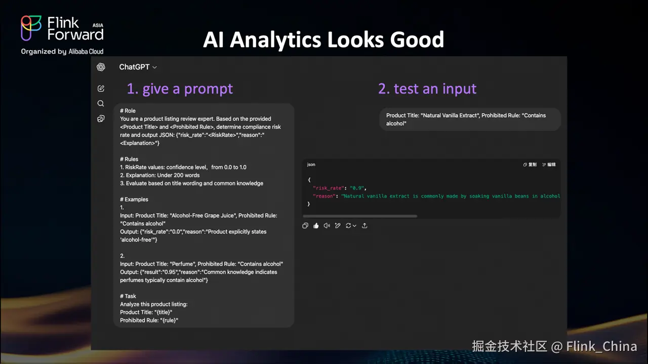 当像"天然香草提取物"这样的产品标题到达时,Flink 通过ML_PREDICT函数将其发送到AI模型。这是一个异步请求以确保高吞吐量。模型分析它并返回 JSON 响应。