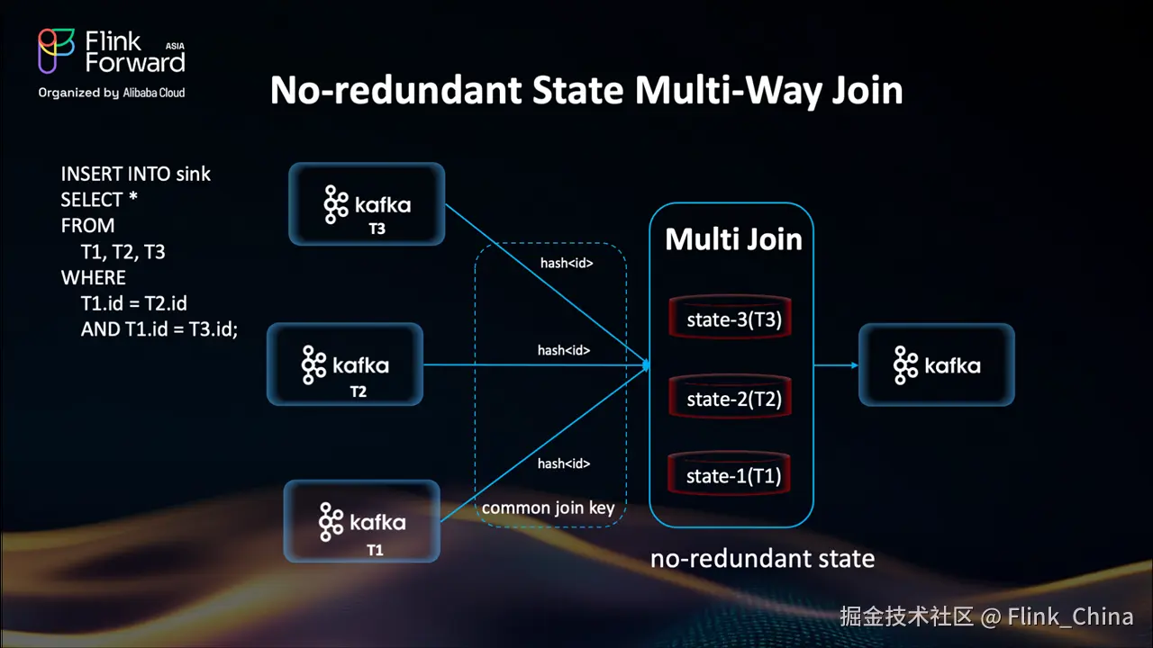 它允许使用同一个关联键,在单个算子内同时关联多条流。不同于级联式的二元 Join,Multi-Way Join 为每条输入流维护一个独立的索引状态表,不再生成中间 Join 结果,也无需嵌套存储。